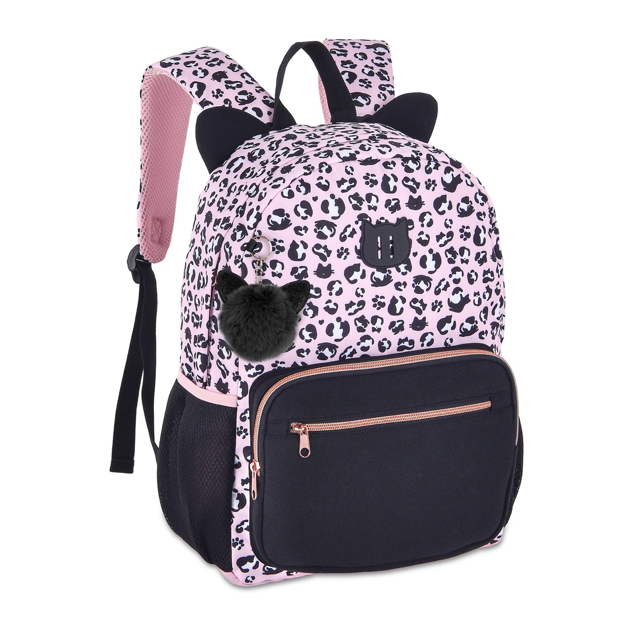 Confeccionadas em nylon com estampa de oncinha, etiqueta de borracha de gatinho e zíper rose gold. Mochila possui orelhas de neoprene e acompanha chaveiro de pompom com orelhinhas.