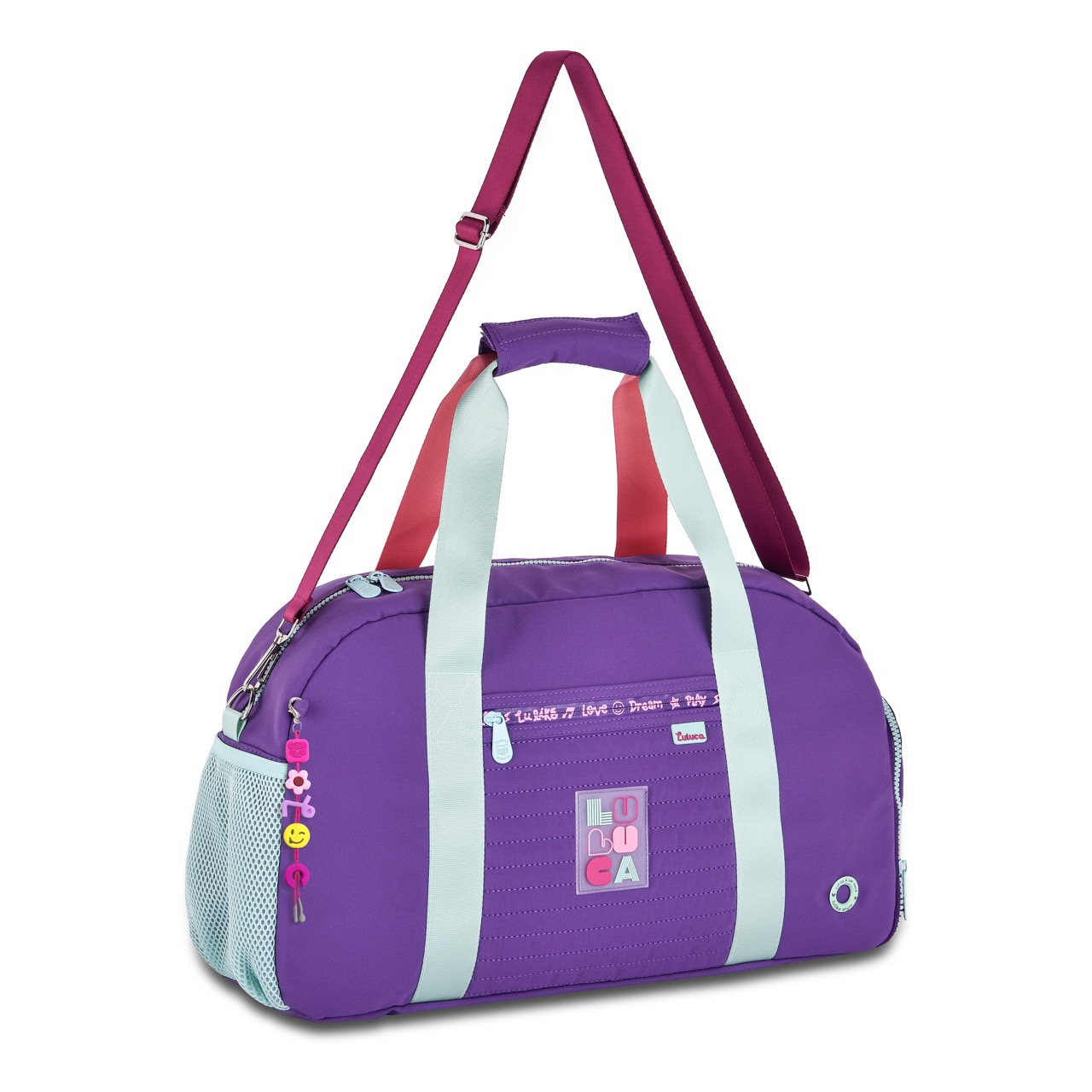 Confeccionadas em nylon com zíper logado, cadarços acetinados coloridos e ilhós personalizado. Sacola possui porta calçados e bolsos internos.