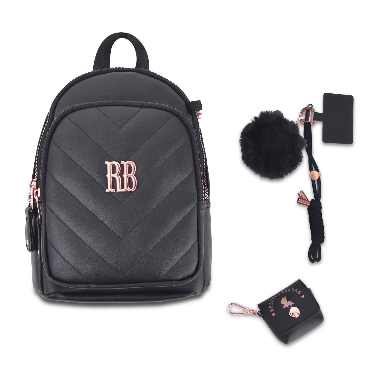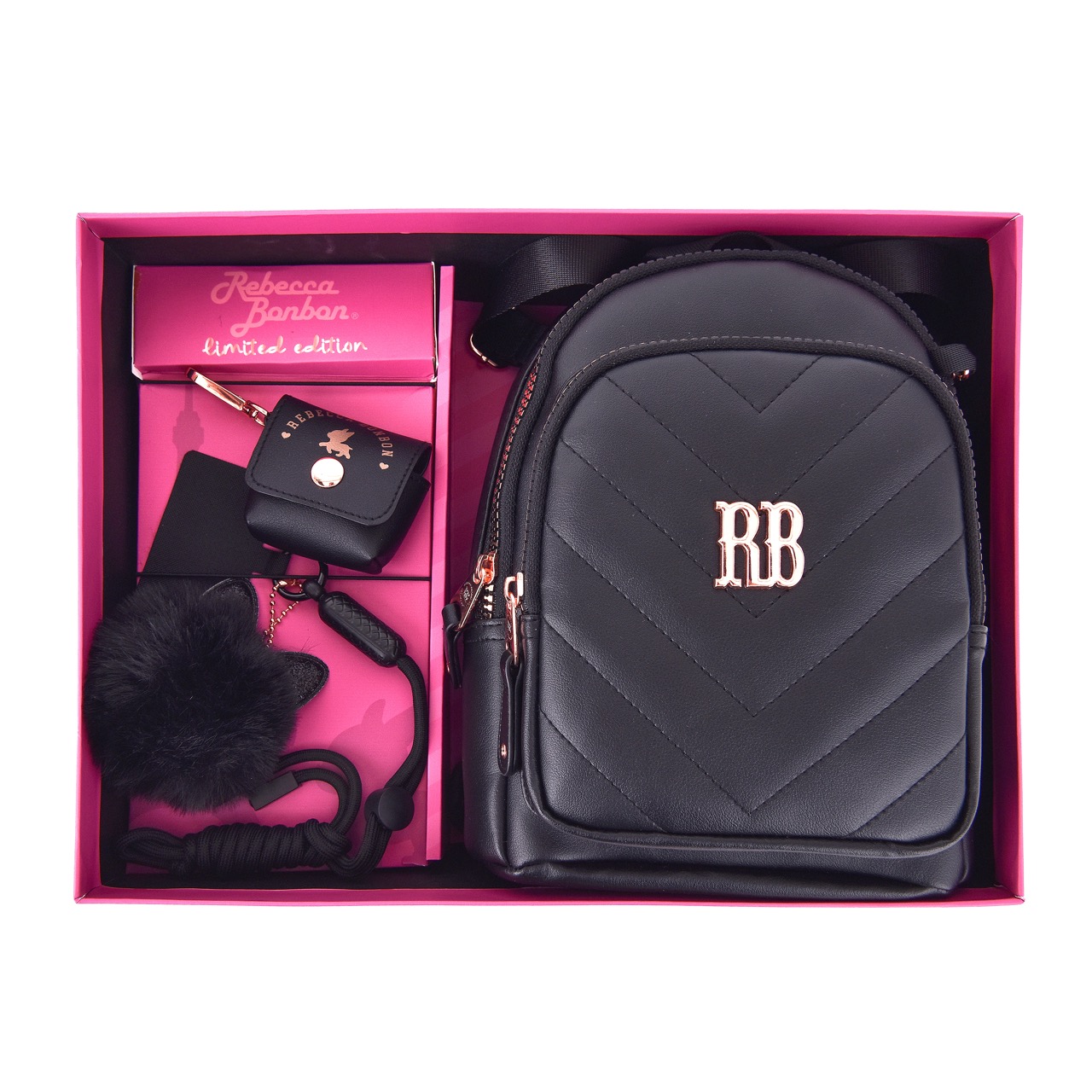 Descubra essa novidade exclusiva para os fãs da Rebecca Bonbon! Uma mini mochila super elegante e versátil, um porta fone de ouvido personalizado e um chaveiro prático com suporte para celular, cuidadosamente selecionados e reunidos em uma linda caixa especial. Quem adora a marca com certeza vai amar ter!
