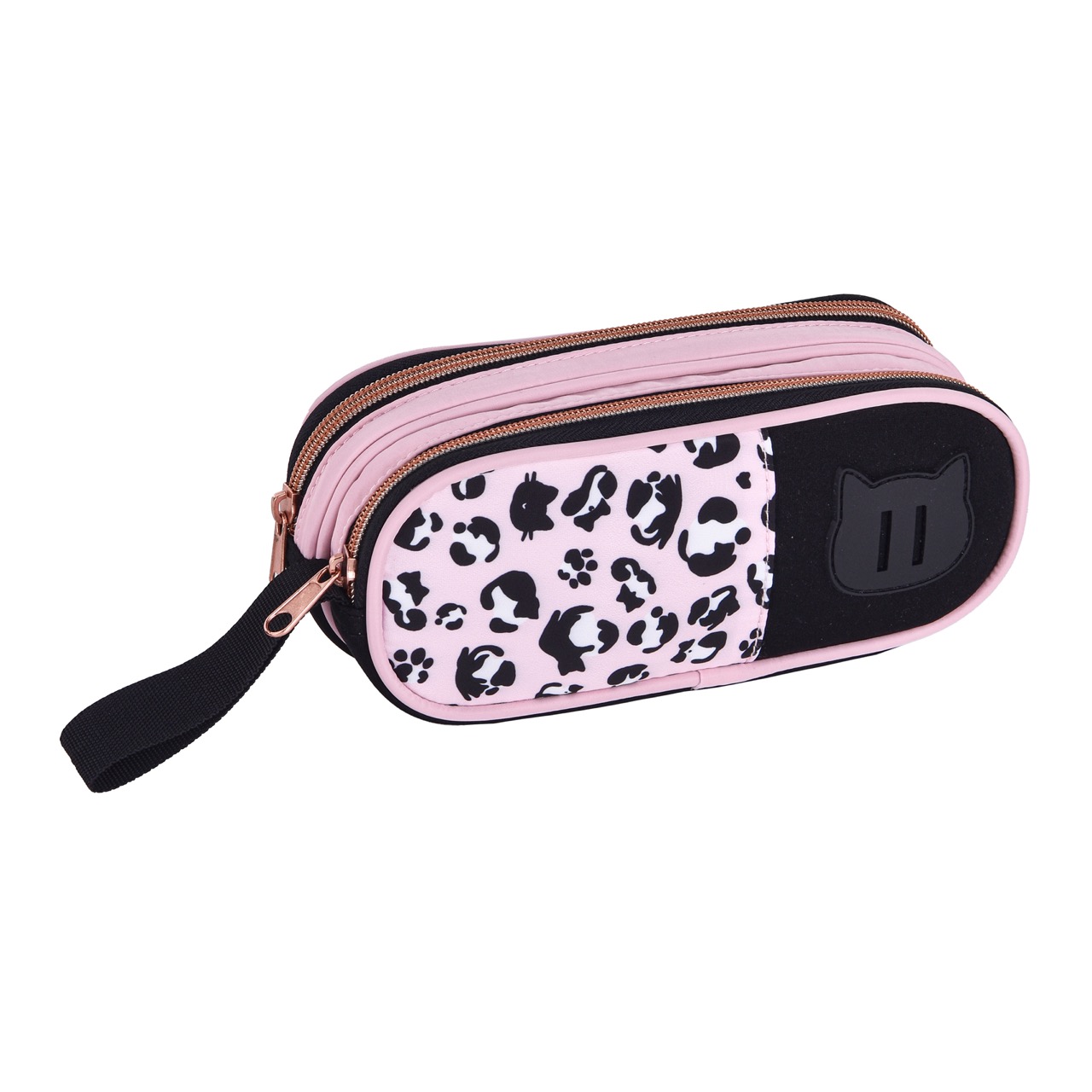 Confeccionadas em nylon com estampa de oncinha, etiqueta de borracha de gatinho e zíper rose gold. Mochila possui orelhas de neoprene e acompanha chaveiro de pompom com orelhinhas.