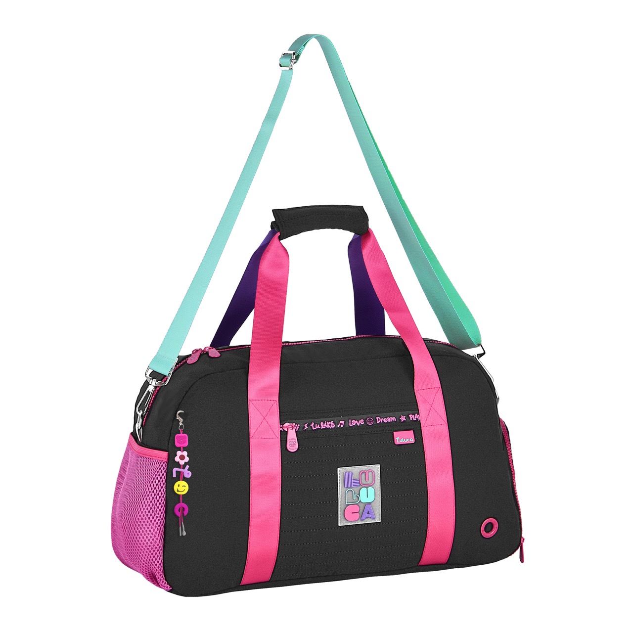 Confeccionadas em nylon com zíper logado, cadarços acetinados coloridos e ilhós personalizado. Sacola possui porta calçados e bolsos internos.